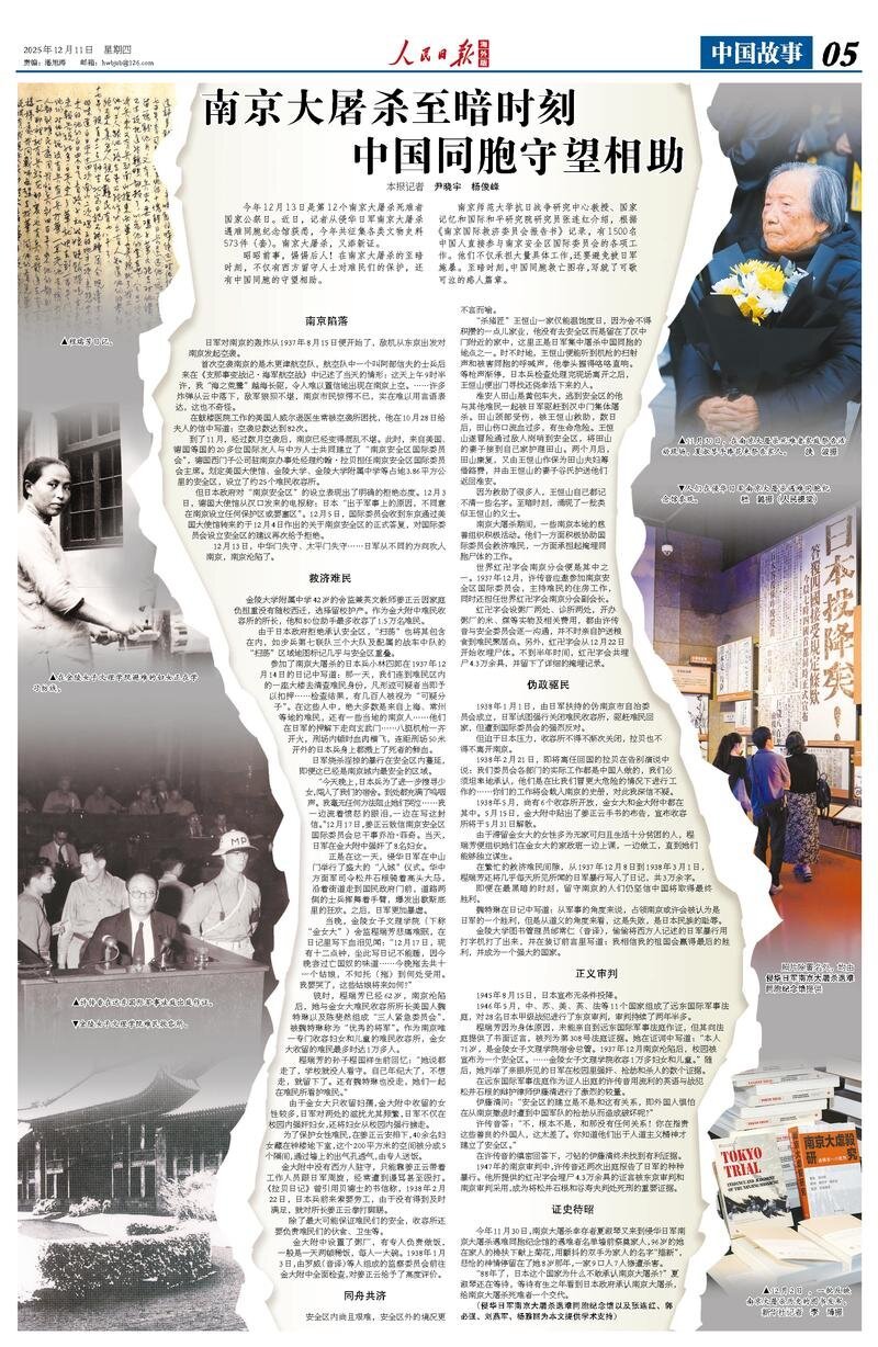 原标题:南京大屠杀最黑暗的时刻:中国同胞守望相助 图片①:郑瑞芳的日记。照片2:被疏散到真陵女子科学艺术学院的妇女们正在学习纺纱。图③:许端印在远东国际军事法庭作证。照片④:建陵女子文理大学难民收容所。图片⑤:11月30日,江东夏树手捧鲜花,向南京事件遇难者家属表示哀悼。杨波供图 ⑥:人们参观侵华日军南京大屠杀遇难同胞纪念馆。供图:杜毅(人民视觉) 图片⑦:12月2日,分析南京事变历史的书出版。新华社 李波 摄 除签名外,所有照片均由南京大屠杀遇难同胞纪念馆提供窗格侵略者。今年12月13日是第12个全国南京事变遇难者公祭日。记者近日获悉,今年日本军方在南京大屠杀遇难同胞纪念馆共征集各类文物史料573套。南京大屠杀又添新证据。揭示以前发生的事情并小心后代。在南京大屠杀最黑暗的时刻,剩下的西方人不仅保护了难民,他们的中国同胞也互相帮助。南京师范大学抗战研究中心教授、国际和平国家纪念研究院研究员张连红表示:根据南京国际救援委员会的报告,有1500名中国人直接参加了南京国际安全区委员会的各项任务。他们不仅承担了许多具体任务sks,但他们也必须躲避日军的暴力。在最黑暗的时刻,中国同胞奋力反抗国家,谱写了感人肺腑的篇章。南京沦陷。 1937年8月15日,日本对南京的轰炸开始。敌机从东京轰炸南京。对南京的第一次空袭是由木更津空军实施的。一位名叫安倍信夫的空军士兵后来在《中国事件:海空战》中描述了当天的情况: 那天早上9点30分左右,我这只“海鹭”飘洋过海,不可思议地出现在南京上空。 ……许多炸弹从天而降,敌军进入帕拉尼科,南京市民震惊不已,但这很难用语言来形容。这并不奇怪。在鼓楼医院工作的美国人威尔逊医生经常受到空袭的影响。他于 10 月 28 日给妻子写信,信中写道: 空袭总数达到d 82. 11 月,经过数月的空袭,南京陷入混乱。当时,来自美国、德国等国家的国际友人和20多位中国人共同成立了南京国际安全区委员会。西门子德国驻南京办事处主任拉贝曾任南京国际安全区委员会主席。划定了面积3.86平方公里的安全区,包括美国大使馆、金陵大学和金陵大学附中,并为难民建立了约25个避难所。然而,日本政府却明确拒绝了在南京设立安全区的想法。 12月3日,德国大使馆从汉口发来电称,日本“不同意出于军事原因在南京设立任何保护区或设防区”。 12月5日,国际委员会收到了一份12月4日从东京通过联合国发出的文件。各国大使馆。他就南京安全区问题发表正式回应,再次拒绝国际委员会设立安全区的建议。 12月13日,中华门、太平门失陷……日军从不同方向入侵南京,南京沦陷。 42岁的救助难民姜震云是金陵大学附中的宿舍主任、英语老师,她决定不随学校西迁,因为她对家庭来说是一个沉重的负担,但她选择留在学校照顾孩子。作为津达大学高中难民收容所的主任,他和他的 80 名助手收容了多达 15,000 名难民。日本政府拒绝承认安全区,因此“清场”也包括安全区。例如,地图上对步兵第7团3个旅及所属坦克连的“清场”区域标记几乎与安全区重合。小林四郎,一名日本士兵1937年12月14日,他在日记中写道:“那天,我们到难民区的一栋大楼里确认难民的身份,那些看起来可疑的人立即被拘留……经过检查,有数百人被认为是“可疑的”。这些人大多是来自上海、常州等地的难民和南京本地人……他们被日军护送到玄武门……八挺机关枪同时开火,刑场上血肉飞溅。死者的血也溅到了距刑场50米处的日本兵身上。虽然安全区已经是日本南京最安全的区域,但军方的暴行(纵火、杀人、强奸、抢劫)却蔓延到了安全区。 “今晚,日本兵进入我们宿舍继续寻找女孩子,到处都是抽泣声,哭声根本停不下来。……我怀着愤怒的泪水写下这封信。”12月17日,蒋正云致函南京国际安全区委员会秘书长乔治·菲奇。当天,日军在金大高中强奸了8名妇女。那天,呵呵日寇在中山门举行了盛大的“入城”仪式。中国中央方面军司令员松井石根骑着一匹高高的马,穿过街道,来到国民政府大门前。那天晚上,真陵女子文理大学(以下简称“金女子大学”)校长郑瑞芳伤心地无法入睡,她在日记中用血泪记录了自己的亲眼所见。征服了这个国家的奴隶,所以我无法入睡写这篇日记……今晚,一共有11名女孩被带走。我不明白。我快要哭了。这些女孩的未来将何去何从?”当时,程瑞芳已经62岁了。南京沦陷后,他与美国人魏特琳、金妇女避难所所长陈飞兰组成“三人紧急委员会”,被魏特琳称为“大将军”。郑瑞芳的孙子郑国祥去世前回忆说:“他说他离开了学校,但学校没有人照顾。他年纪大了,不想离开学校,就留下来了。”沃特兰也没有离开,他们一起照顾难民中心的难民。”因为金女大只招收女生和男生,而金大附中的女校规模较大。特别是,日军对这两所学校的骚扰尤为频繁。日军不仅在校园内强奸妇女,还在校园外强行绑架她们。为了保护难民,蒋正云安排了40多名妇女躲进钟楼的地下室。 200平方米的空间分为五个部分,通过墙壁上的通风口进行通风,并由专门的工作人员提供膳食。金达高中没有西方人驻扎。因此,蒋正云只得率领部下与日军对峙。他们经常被骂,甚至被殴打。 《拉贝日记》曾援引贝德什的一封信称,1938年2月22日,日本士兵抵达这里寻找人手。因未能及时满足,对姜正云导演