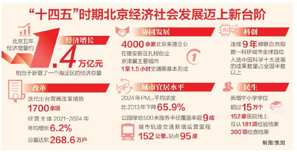 春天来了,夏天来了,东西一年比一年丰富。将一个伟大的项目变成美好的现实需要五年的时间。五年前规划的战略任务和重大工程全面落实,非凡困难挑战一一化解,大风大浪的重大挑战一一承受,北京确立了“十四五”时期高质量发展的新坐标。过去的五年,是北京与全国同频共振的五年,是人民美好生活愿景变成幸福现实的五年,是改革铺路的五年。全市上下坚持引领新时代首都发展,凝聚力量奋斗发展,在我国现代化进程中谱写不平凡的篇章。同频共振运行的上景山首都公园车站下,可从万顺阁眺望南北,红墙黄瓦与秋叶交织,将古城衬托得更加雄伟迷人。近日,北京中轴线独特的辉煌占领了无数人的朋友圈。各个镜头捕捉到的画面相叠加,全景展现了古今交融的泱泱大国首都的雄伟大气。去年7月,北京中轴线12年来首次成功申请世界遗产。整个古城一脉相承,推动整个古城的保护和复兴。从推动100多个文化资产保护修复项目,到认定312栋历史建筑丰富,探索形成“申请式借贷”、“共生庭院”等特色做法……北京严格落实要求“老城不能再拆了”,老城文化遗产的历史格局正在逐步恢复。进入新时代,我们面临这样的问题:“我们应该建设什么样的资本、如何建设?”有着3000多年建城史、870年建都史的北京该如何应对?五年来,我市以实现“城市”功能为重点,组织推动“城市”发展,以更加先进的“城市”发展服务保障“城市”功能。中央政务空间形象更加庄重肃穆,首都文化在保护传承中繁荣发展,国际综合交流能力不断增强,国际科技创新中心建设成效显着。 Capi的优化与改进城市功能不断提升,对现代都市区的蓬勃发展产生了额外的影响。马苏。早上6点,复兴号列车离开北京西站,在阳光的照耀下匆匆赶往雄安新区。车上还有宣武医院的医生、中关村的客商、到现场参观的客商……这些都是北京为支持雄安新区建设尽自己的一份力量的缩影。距北京中关村100多公里,还有另一个中关村。 “以前我们是北京中关村的‘村民’,现在我们是西安中关村的‘村民’。”天融信公司副总裁刘军第一次感受到雄安“快”。短短两年时间,雄安中关村科技园区聚集了200多家高科技企业,形成了创新“小气候”。千年计划持续很长时间。民族l 战略对于全局至关重要。京津冀协同发展是我国新时代第一个重大区域战略。 “十四五”期间,北京能够发挥“一个核心”的优势,有力推动整个地区高质量发展,更好地落实京津冀地区实现繁荣的国家大战略。创新链与产业链的融合就是证明。 “十四五”以来,中国对天津、河北省政府技术出口合同成交额已达2308.7亿元,几乎是“十三五”期间总额的两倍。查看更多北京技术 技术成果已在天津、河北地区转化实施。普通人正在经历。三大机构联合成立115所融医疗联盟,与1300多家医疗机构互认临床试验结果。 2024年,三地PM2.5年均浓度较2020年下降约20%,空气质量提升3倍。首都高质量发展不仅与国家战略发展方向一致,也与科技革命和新一轮产业变革产生共鸣。如果我们看看北京的“十四五”规划,有一个指标值得考虑。 “每万人高价值发明专利数”的目标定为82件左右,但到2024年,这一指标将几乎翻一番,达到159.8件。党中央“十四五”规划建议首次提出支持北京建设国际科技创新中心。 “多年来,我们牵头成立了g领导教育科技人才工作,着力提高创新体系整体效率,打造新质量生产力重要动力。 ”市发改委主任杨淑玲说。怀柔国家综合科学中心已安装和建设的37个科技设施平台中,有29个已进入科研阶段,成为全球基础设施和重要科技结构最集中的地区之一。中关村科学城产生了全球首个全球统一多模联运模式、中国大陆首款自主研发的3纳米系统级芯片小米炫界等重大创新成果。从城市看,北京有国家重点科研机构145家,占总数的近30%。全社会研发投入强度保持在6%,跻身全球创新力最强的城市之列。入选中国十大科学突破的成果数量占全国一半以上……作为全球创新网络的重要基地,北京应该为建设全球科技基础设施最密集、科学家被引用次数最多、科研主体规模最大、开放创新生态系统最具竞争力的科技强国做出更多贡献。最好的答案就是把人民的生命放在第一位。北京“十四五”成绩单上既有“实力”又有“温度”的数字。就业是千家万户的头等大事,也是市委、市政府关心民生的头等大事。全市打出空前强劲、针对性强的“组合拳”,平均新增27.8万人每年征集发布毕业生就业岗位10万余份。与民众对好医院、好医生的期待相反,优质医疗资源正在加速向薄弱地区转移。平原新庄等医院每千户常住人口床位数达到5.09张,较2021年增长14.6%。峨田地区,清华长庚纪念医院、积水潭医院改扩建,友谊医院顺义院区成功开设诊所。每个综合医院都有一名儿科医生。一些数据既包括“新想法”又包括“意图”,例如司机在网上叫车和送货司机在户外跑步。研究发现,人群造成工作场所事故的风险很高。旅游、外卖等行业在实施工伤保护制度方面处于领先地位。共有157万人拥有近三年投保保险,保障了越来越多群体的工伤事故权益。考虑到99%的老年人选择居家养老,我们将从头开始开设122个区域老年人服务中心,提供专业、全面的养老服务,让老年人在家也能得到护理。人民想要的,也是政府想要的。 “十四五”